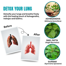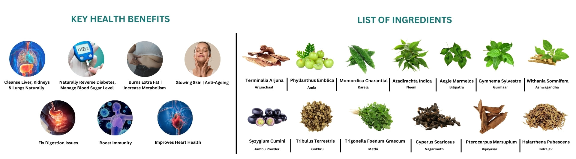 Herbs like Neem, Karela, and Gokhru promote liver detoxification, while Gokhru and Jambu Powder support kidney health by flushing out toxins. Additionally, Bel Patra and Nagarmoth help detoxify the lungs, improving respiratory health.